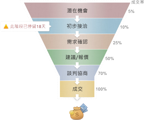 自訂標準化銷售流程,從潛在機會到成交,記錄商機推進的重要時間點;自動計算進行天數、停留時間、推進率等重要指標,幫助主管了解開發進程,進而幫助業務人員掌控有效跟進時機,提升銷售績效。