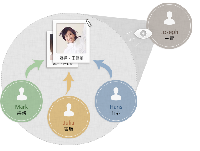 整合客戶個人資料、喜好特徵、往來歷程、相關工作、人脈關係、聯繫頻率等等,所有客戶相關資訊一應俱全。